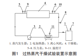 過熱蒸汽干燥試驗(yàn)裝置,主要包括蒸汽發(fā)生器、 電加熱式過熱器、干燥室和離心風(fēng)機(jī),如圖1所示; 博迅GZX-9140MBE電熱鼓風(fēng)恒溫干燥箱(上海博迅公司);DA 200型電子天平(莆田市亞太計(jì)量儀器有限 公司);BSA 224 S-W型電子分析天平(德國賽多利 斯集團(tuán));CR-410色彩色差計(jì)(柯尼卡美能達(dá)科技 有限公司)。